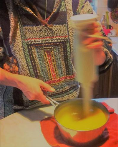 Ora è il momento di passare al frullatore a immersione; fate attenzione agli schizzi e mescolate pochi secondi per volta, alternando pause per controllare lo stato del sapone e per evitare che il motore si scaldi troppo.